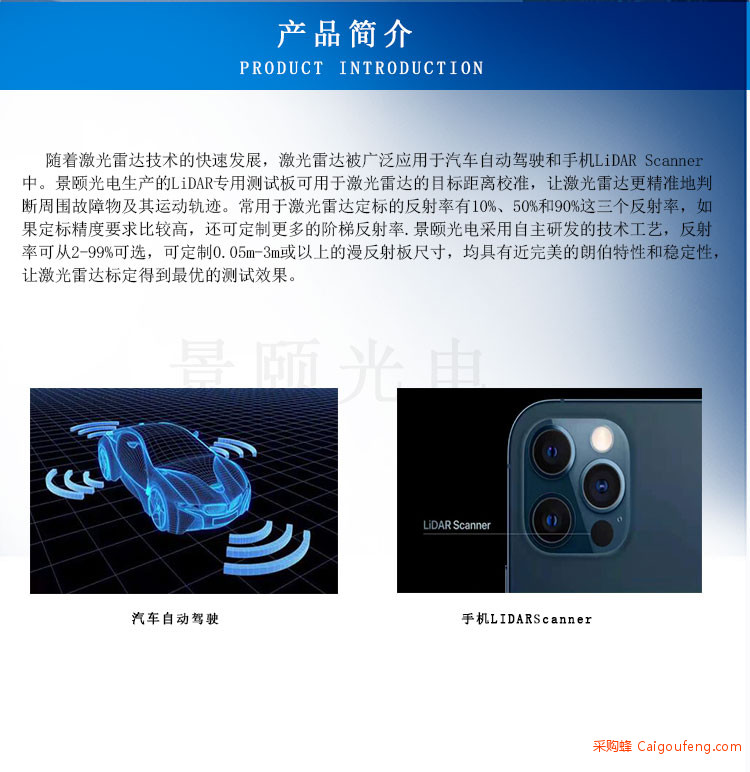 景颐光电采用自主研发的技术工艺,反射率可从2-99%可选,可定制0.05m-3m或以上的漫反射板尺寸,均具有优良的朗伯特性和稳定性,让激光雷达标定得到比较好的测试效果。